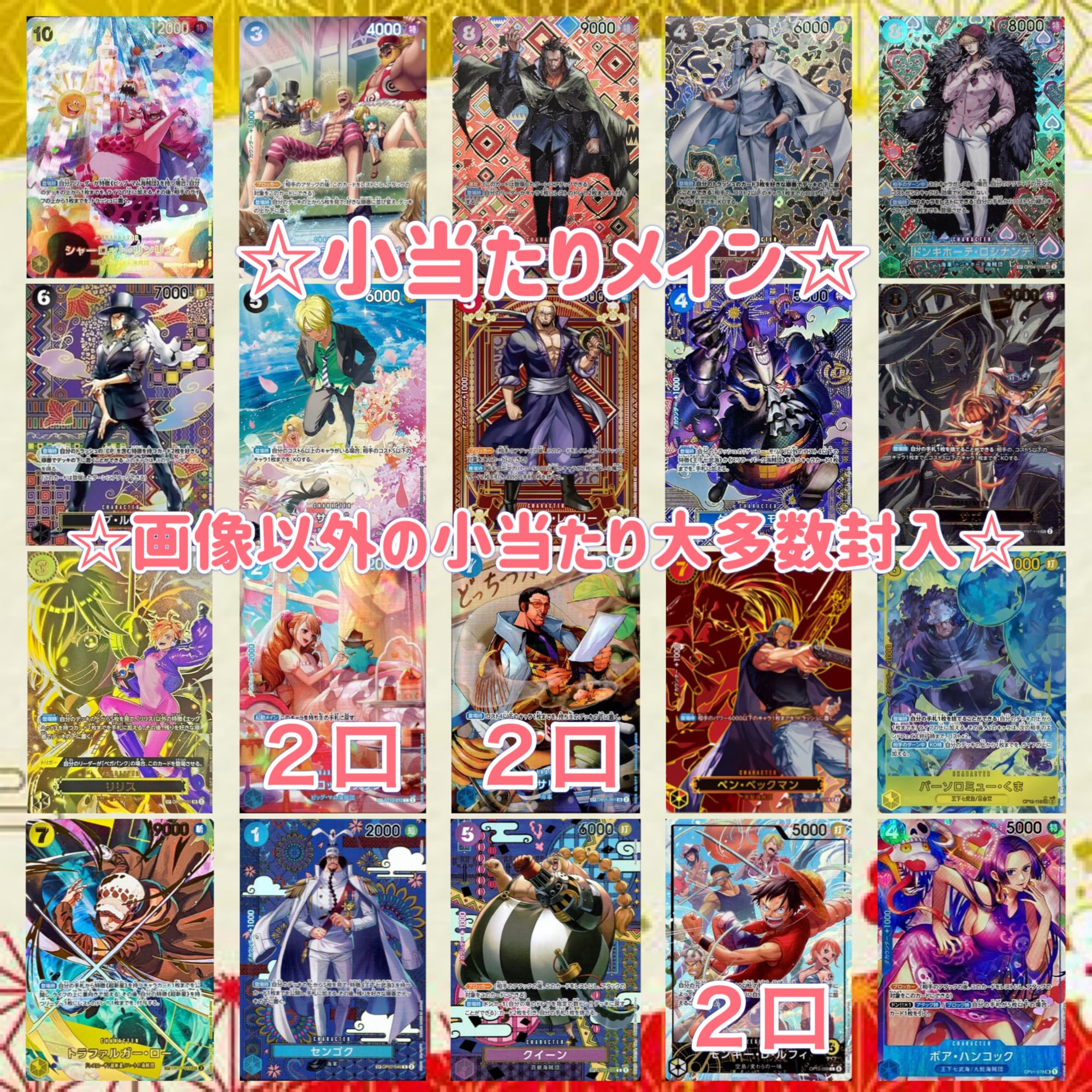 中当たり小当たりは販売相場が下がり当たり枠に値しない可能がでる場合がございます。また当たりが大きい分ハズレ枠がキツく感じ恐れがございますので、こちらの内容をご了承の上でご検討、ご購入を頂けますと幸いです。
